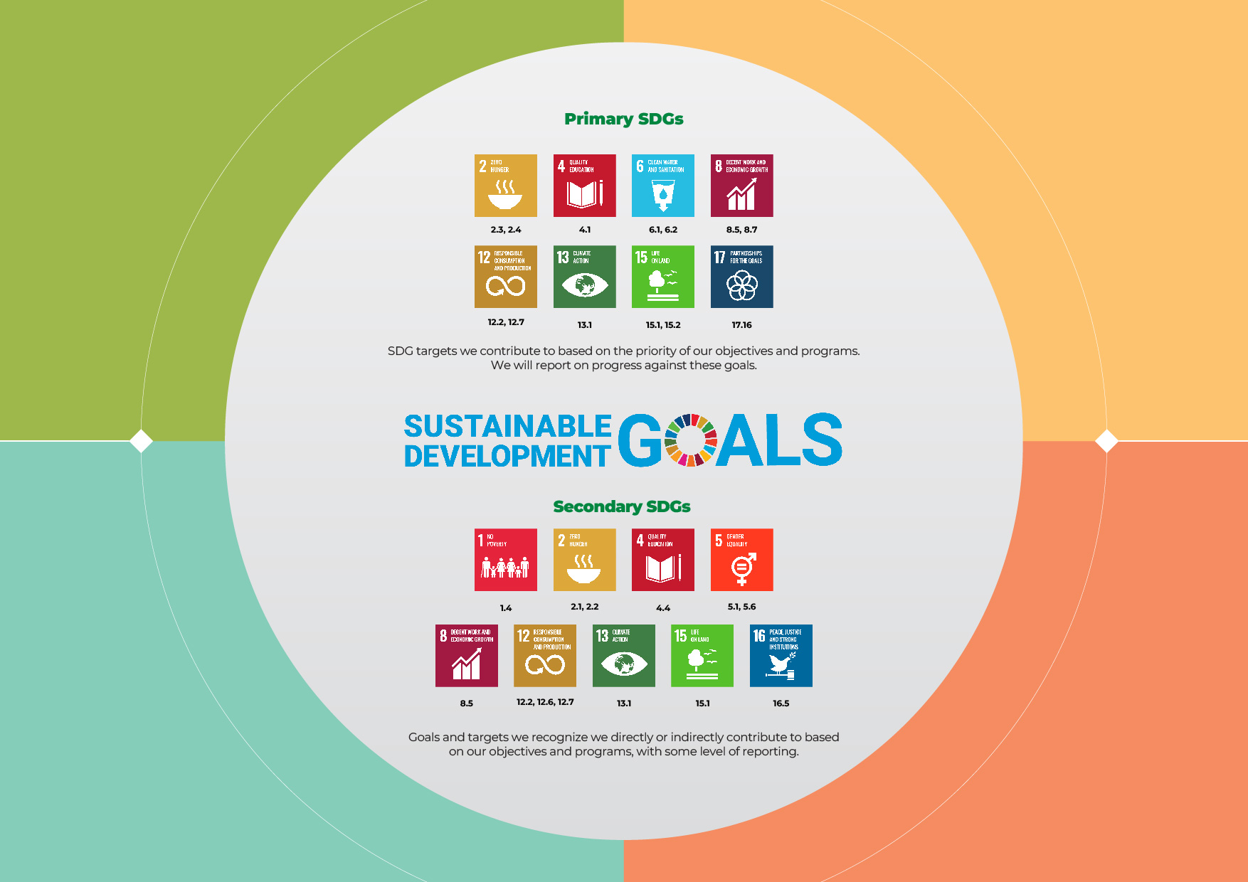 Kami memetakan topik-topik penting dan tujuan program kami ke dalam SDGs dan target-targetnya, menguraikan SDGs primer dan sekunder yang kami kontribusikan. Kami meninjau kembali pelaksanaan laporan ini sebagai bagian dari pembaruan materialitas tahunan kami dan juga memetakan risiko dan peluang hilir kami.