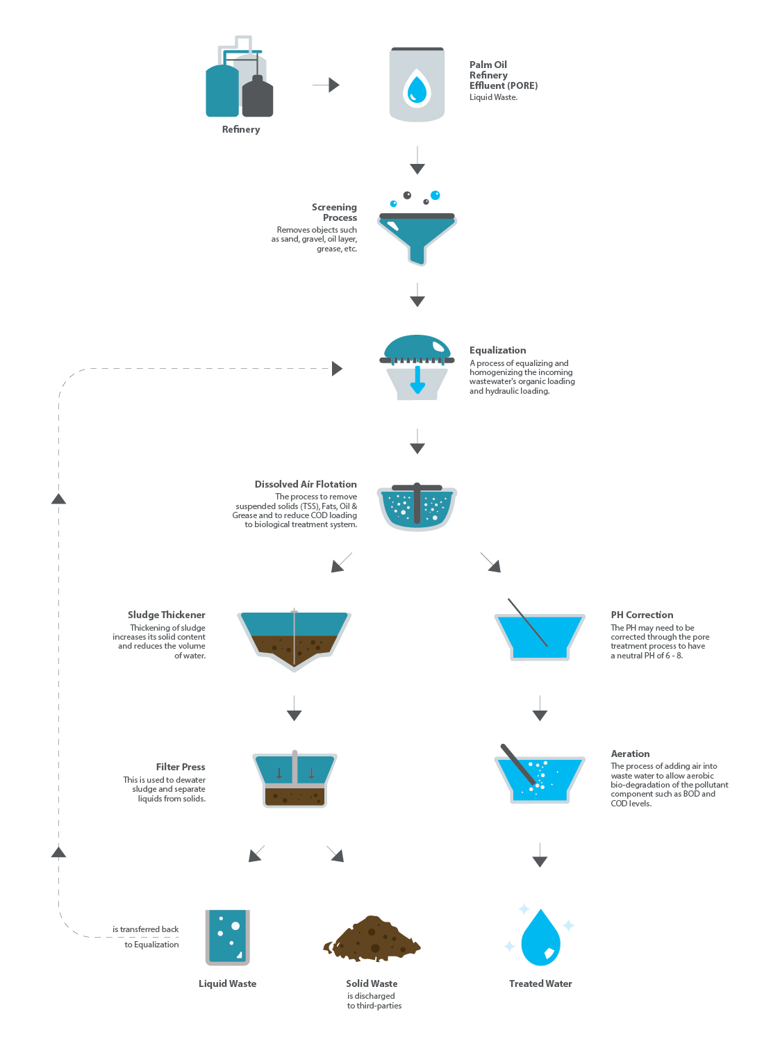 PORE diolah di pengolahan air limbah kami untuk mengurangi tingkat BOD dan COD. Pelajari lebih lanjut tentang sistem pengolahan PORE Musim Mas di bawah ini:
