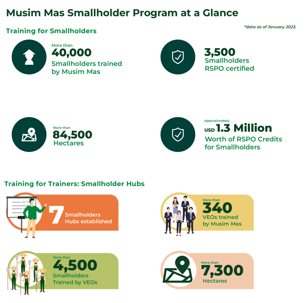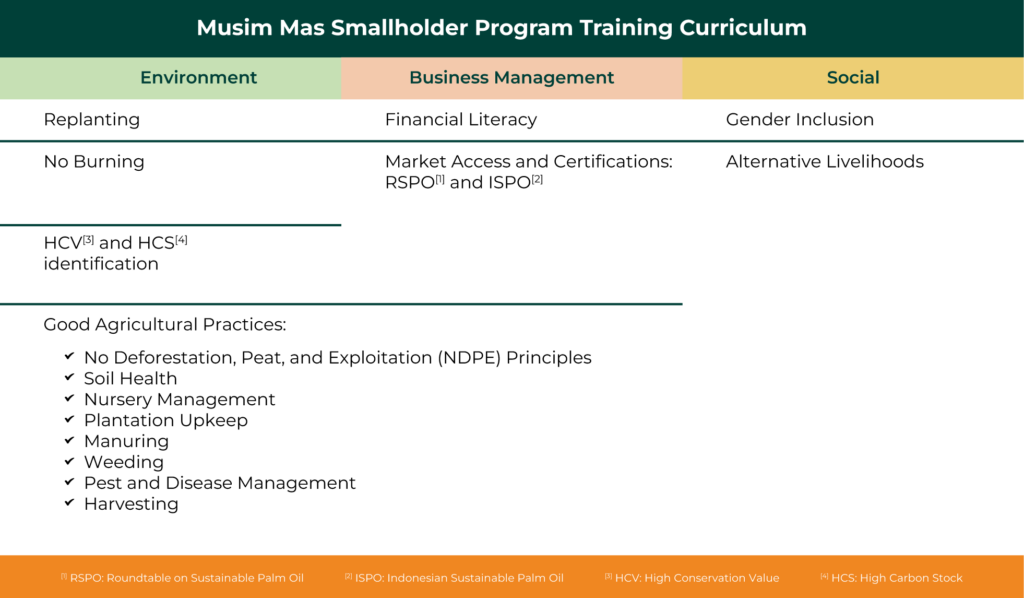 Formulated with support from the International Finance Corporation (IFC), a member of the World Bank Group, Musim Mas’ Smallholder Program was first developed to equip smallholders with skills that would align them with the Roundtable on Sustainable Palm Oil (RSPO) Principles and Criteria. It is structured into topics on Environmental issues, Business Management, and Social issues.
