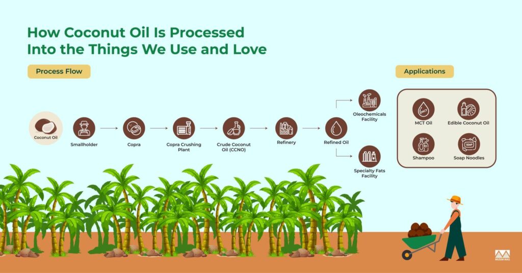 Minyak kelapa juga dapat disuling lebih lanjut menjadi oleokimia dan specialty fats untuk menghasilkan berbagai produk, termasuk surfaktan berbahan dasar kelapa untuk sampo, dan minyak MCT, yaitu makanan kesehatan yang paling sering dikonsumsi sebagai suplemen. Produk-produk ini diproses di kilang Musim Mas di Sumatera dan Surabaya.