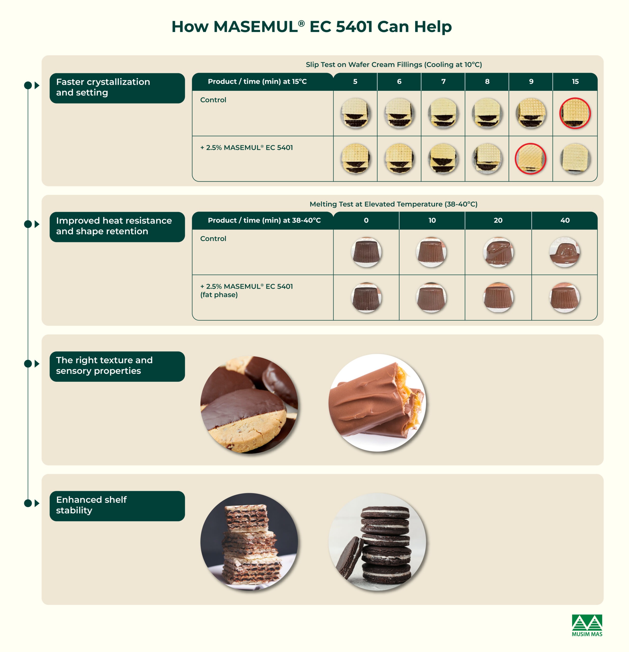 Campuran pengemulsi terkemuka dapat mengatasi masalah ini dan memberikan manfaat fungsional bagi produsen manisan. MASEMUL® EC 5401 dari Musim Mas menonjol dengan keunggulan-keunggulan berikut: