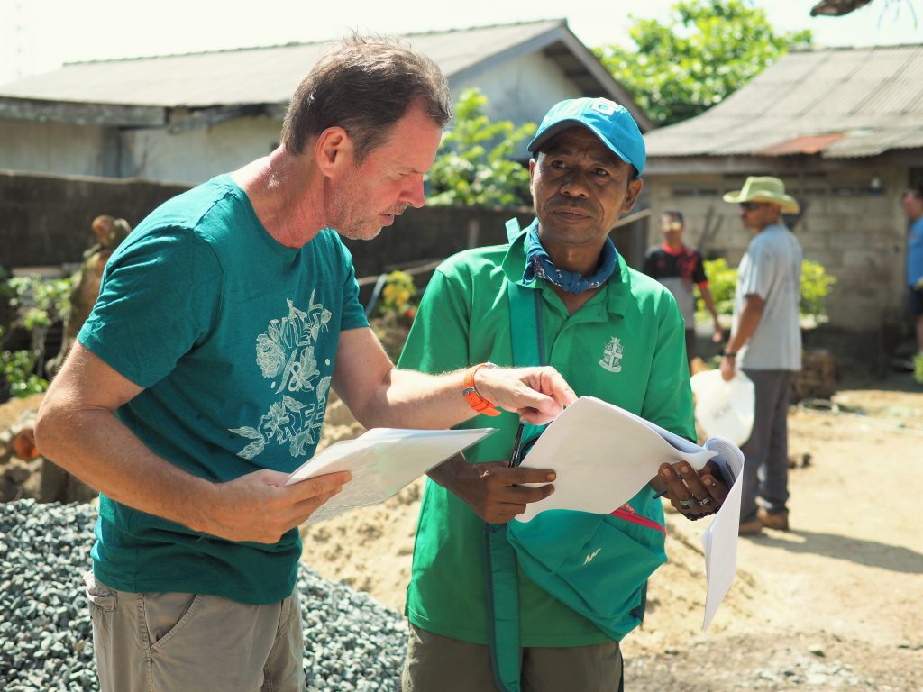 (Atas) Dr. Marc van Loo, salah satu pendiri SWG, membahas panduan konstruksi dengan staf lokalnya, Conty.