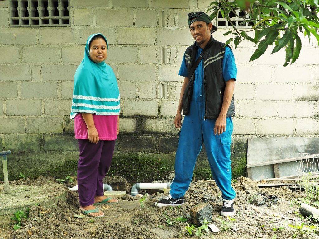 Pemilik rumah Iswinarti dan Dedi dari tim SWG, berdiri di kebun di depan sistem SWG yang telah ditingkatkan setelah pemeriksaan rutin.