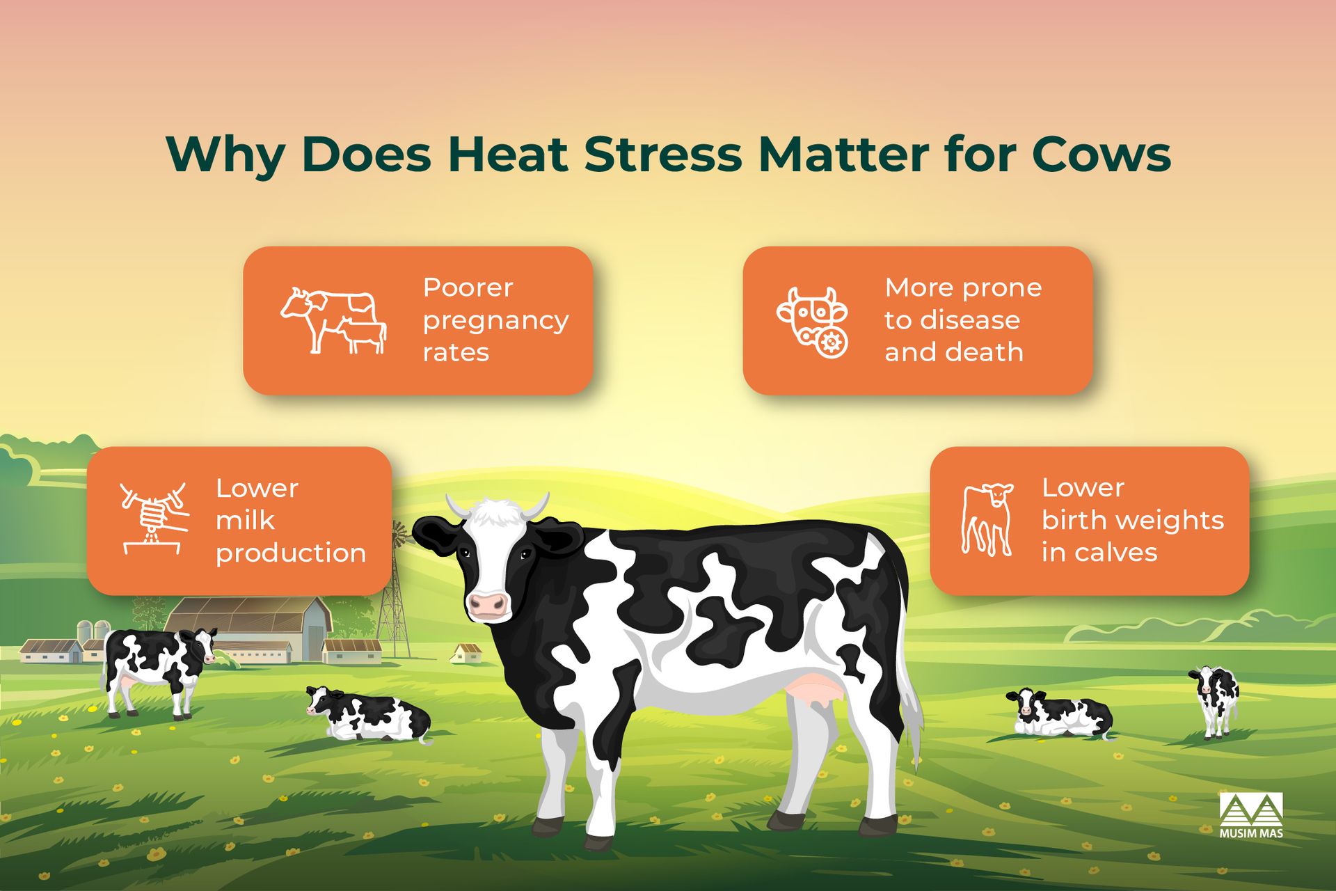 Stres akibat panas (heat stress) dapat mengakibatkan suhu tubuh lebih tinggi dan berdampak signifikan terhadap kesehatan dan produktivitas ternak, termasuk: