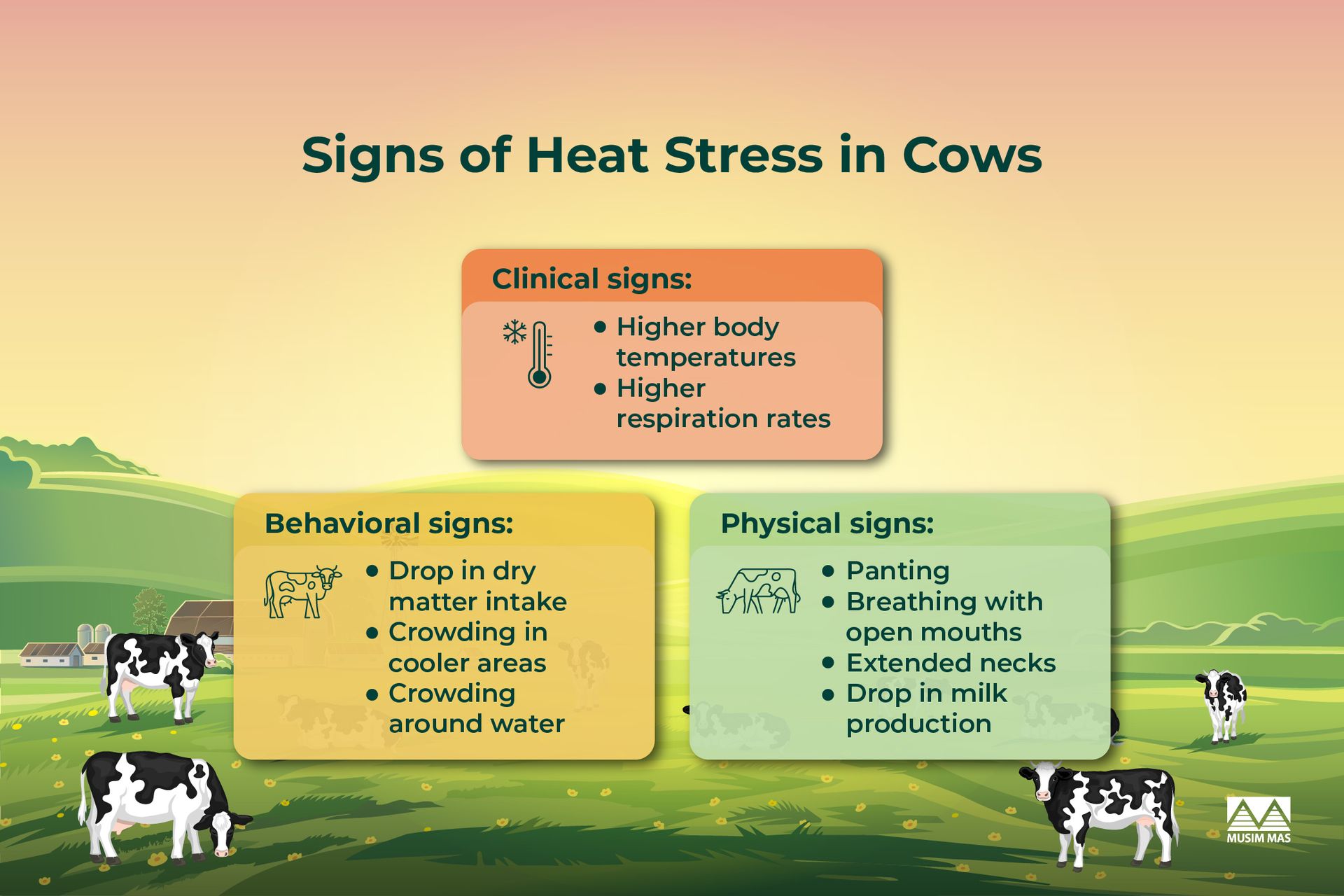 Penting untuk diingat bahwa suhu inti sapi mencapai puncaknya sekitar dua jam setelah suhu lingkungan puncak pada hari itu. Diperlukan waktu setidaknya enam jam untuk menghilangkan panasnya. Beberapa tanda utama heat stress yang harus diwaspadai adalah: