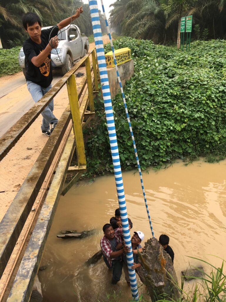 Tim Pengelola Gambut Musim Mas memasang tiang pengukur untuk memantau ketinggian air sungai