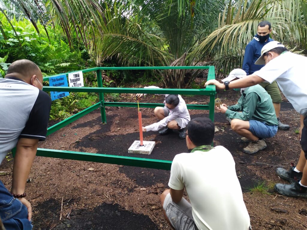 Manajer Pengelolaan Gambut kami, Julia mengukur penurunan tanah gambut