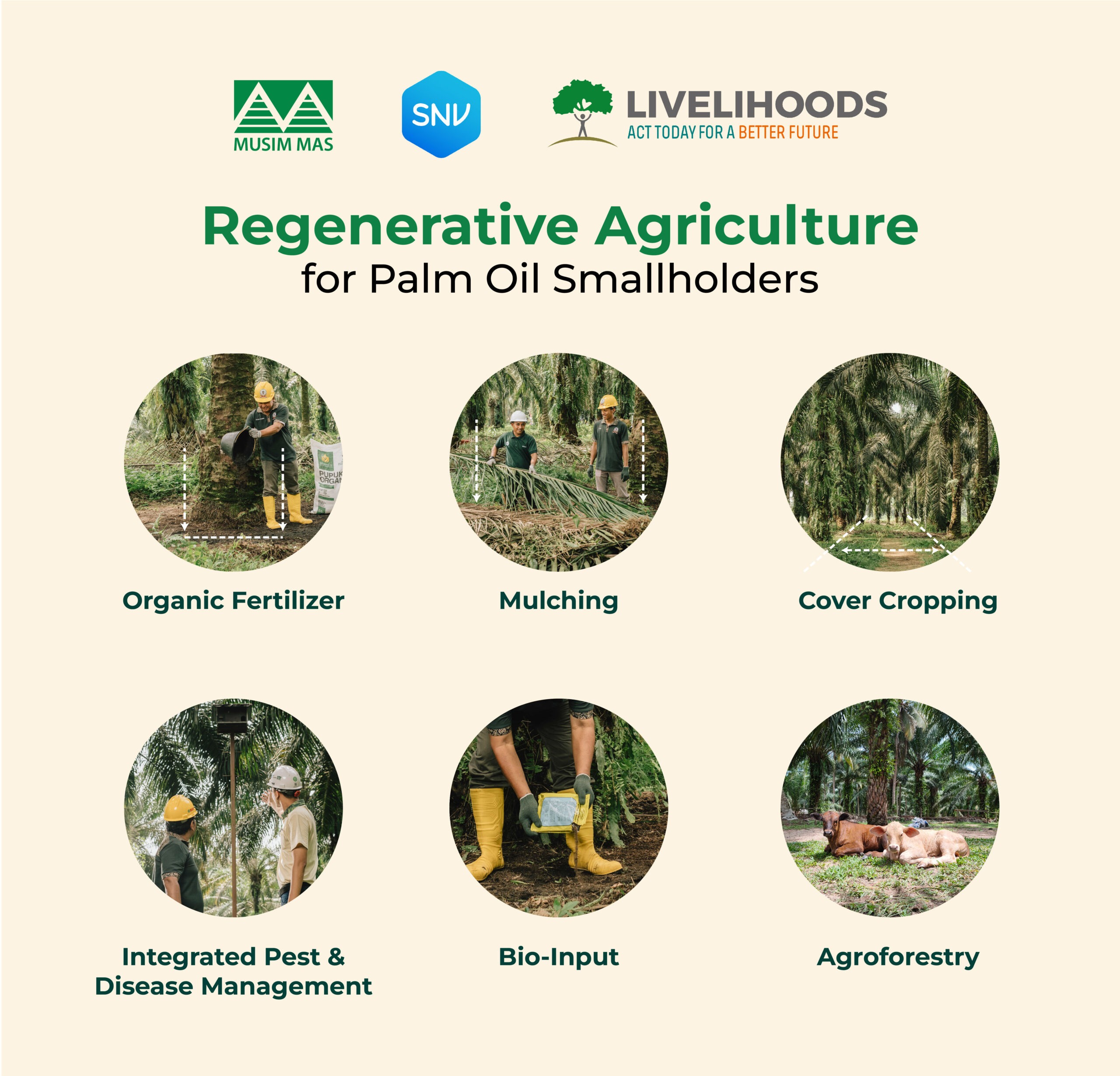 Dengan latar belakang ini, sebuah proyek Penghidupan untuk pekebun swadaya diluncurkan tiga tahun lalu oleh Musim Mas, bermitra dengan Livelihoods Fund for Family Farming (L3F), SNV, World Agroforestry (ICRAF), dan konsorsium dengan perusahaan-perusahaan produk konsumen. Inisiatif jangka panjang ini juga dikenal dengan program Biodiverse and Inclusive Palm Oil Supply Chain (BIPOSC). Proyek ini bukan sekadar upaya tanggung jawab perusahaan – ini adalah pendekatan transformatif dibidang agrikultur yang bertujuan untuk mempromosikan praktik regeneratif, merehabilitasi lahan perkebunan yang terdegradasi, dan meningkatkan keberlanjutan dan ketahanan pekebun swadaya di Sumatera Utara, Indonesia.