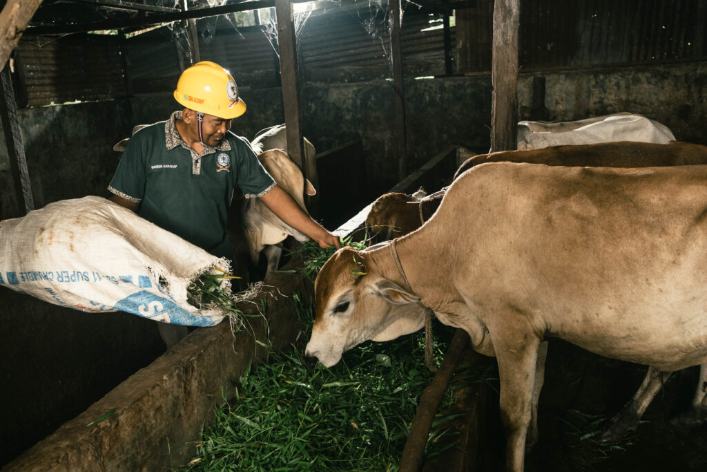 Bahrun adalah Farmer Champion yang bersemangat dan sangat terlatih. Selain menerapkan perkebunan regeneratif di lahannya, ia juga memproduksi pupuk organiknya sendiri dari kompos kotoran sapi dan sampah daun. “Setelah mempelajari tentang pengomposan, saya mulai membuat kompos di rumah. Hal ini membantu saya menghemat banyak biaya pupuk, dan saya merasa struktur tanah di lahan saya membaik—tidak lagi seperti tanah liat. Dengan uang yang saya hemat dari pupuk, saya juga memperoleh lebih banyak modal untuk membeli benih dan menanam tanaman lain, dengan menerapkan pendekatan agroforestri,” kata Bahrun.