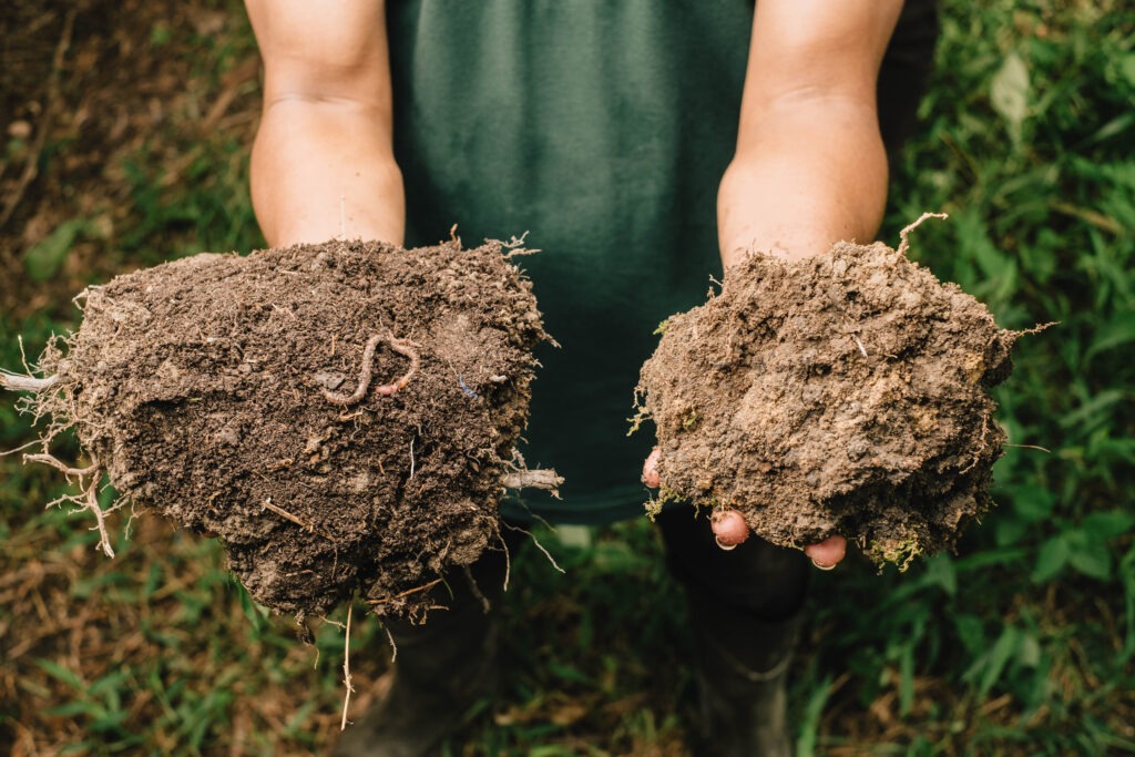 Kesehatan tanah yang lebih baik: Gambar di sebelah kiri menunjukkan tanah dari proyek yang telah diolah dengan kompos sehingga tekstur tampak lebih baik. Keberadaan cacing menunjukkan bahwa tanah tersebut memiliki nutrisi yang lebih baik. Tanah di sebelah kanan terdegradasi akibat penggunaan pupuk kimia yang berlebihan dan memiliki tekstur seperti tanah liat.