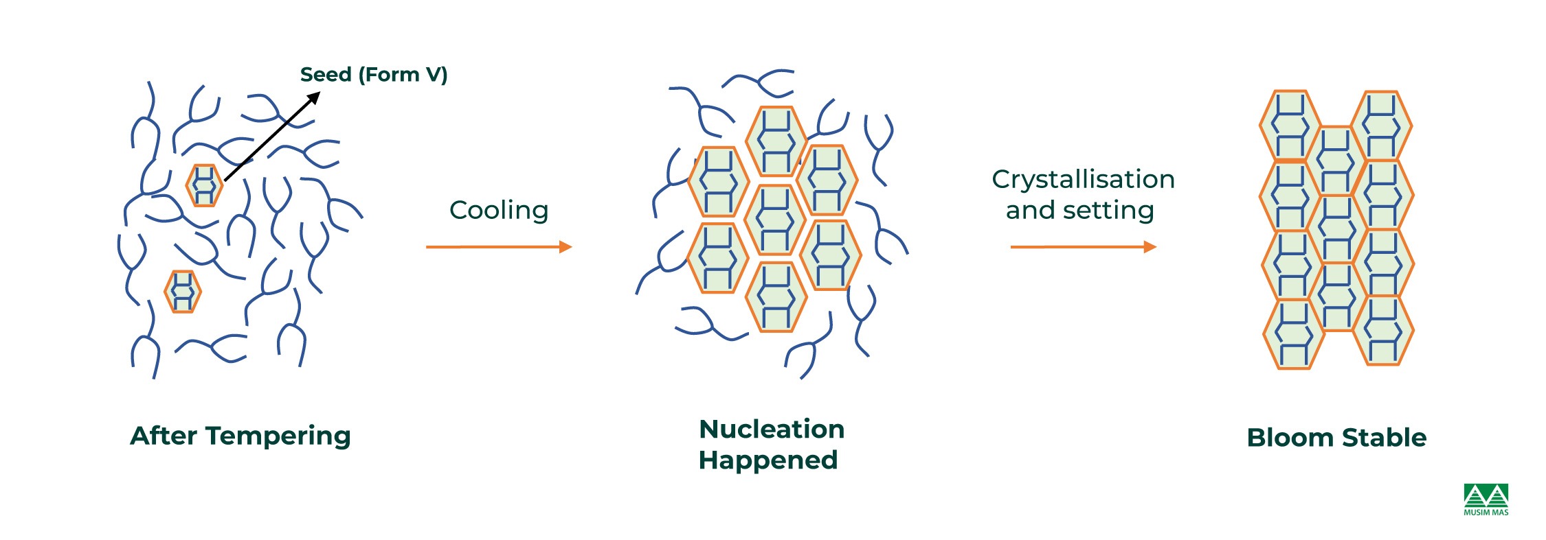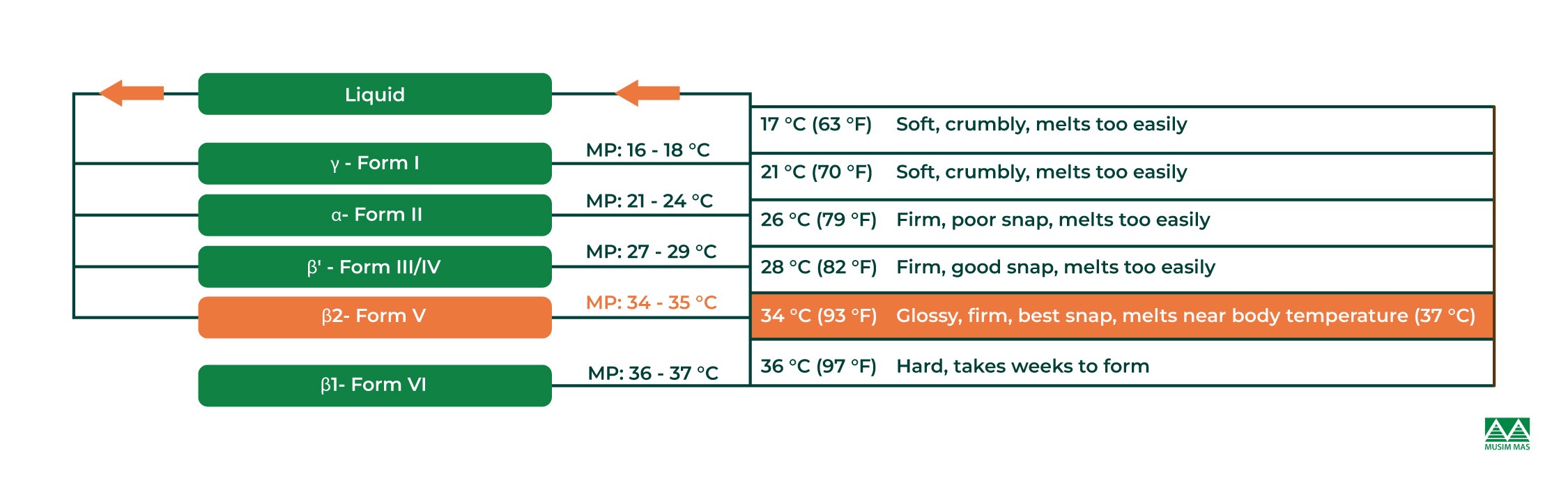 - Reheating (29–32°C): Unstable crystals (I – IV) melt, leaving only stable Form V.