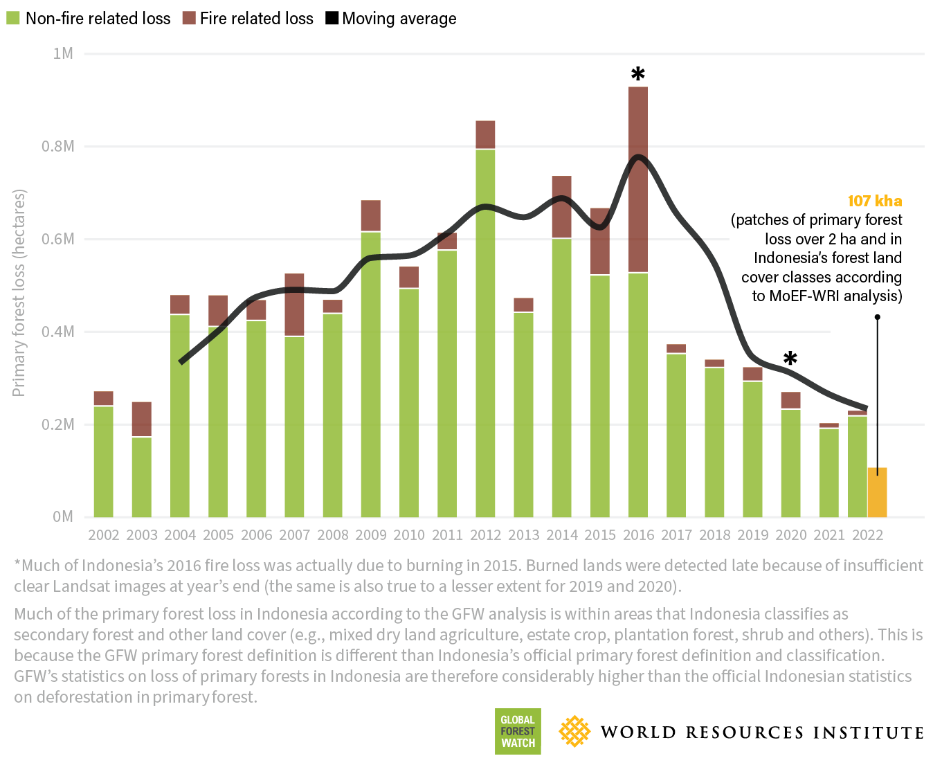Indonesia and Malaysia shine as deforestation success stories. A recent Global Forest Watch (GFW) data shows Indonesia and Malaysia, major palm oil producers, achieving substantial drops in primary forest loss. Indonesia’s deforestation decreased by 64% in 2015-2017 and 2020-2022, leading all tropical nations.