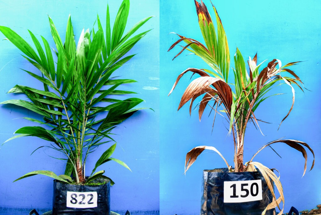 The left image shows a healthy palm, while the right shows one infected with Ganoderma.