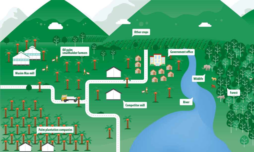 In practice, a landscape approach is a collaborative effort among multiple parties to implement conservation on a landscape level. It is usually headed by a lead organization or agency, along with other partners such as NGOs, private sector players, and government agencies, working on a common goal to move forward. With smart collaborations, groups with different perspectives can turn the world’s most efficient oil crop into a model of sustainable development.