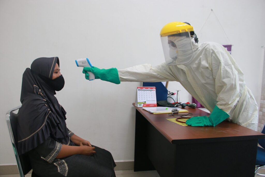 As part of a dry run to prepare for confirmed COVID-19 cases, Dr. Chrisdiansyah dons his PPE and takes the temperature of a worker who exhibits symptoms.