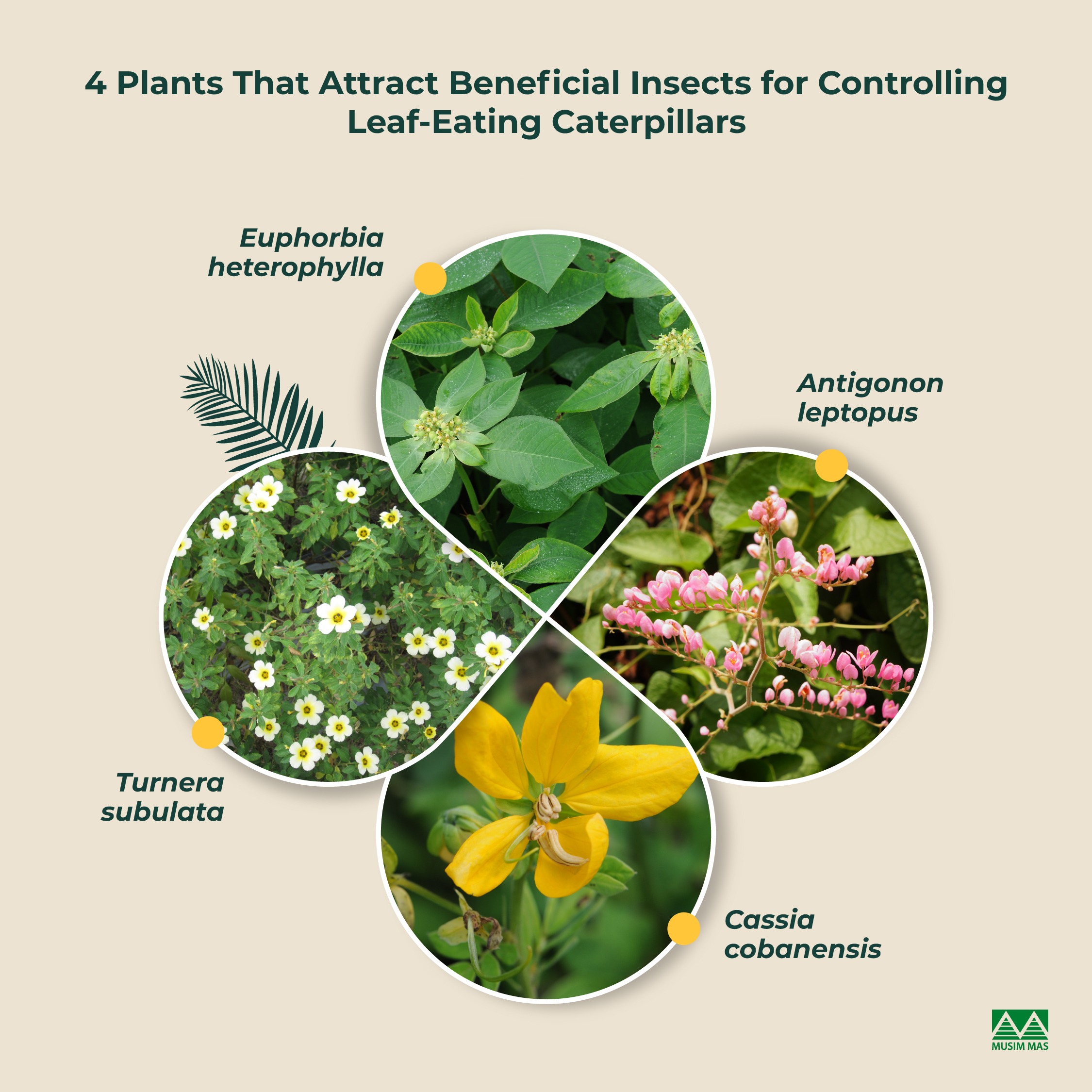 Let’s explore how beneficial plants like Cassia cobanensis, Turnera subulata, Antigonon leptopus, and Euphorbia heterophylla help reduce the need for chemical pesticides in oil palm plantations, offering a sustainable way to manage leaf-eating caterpillars.