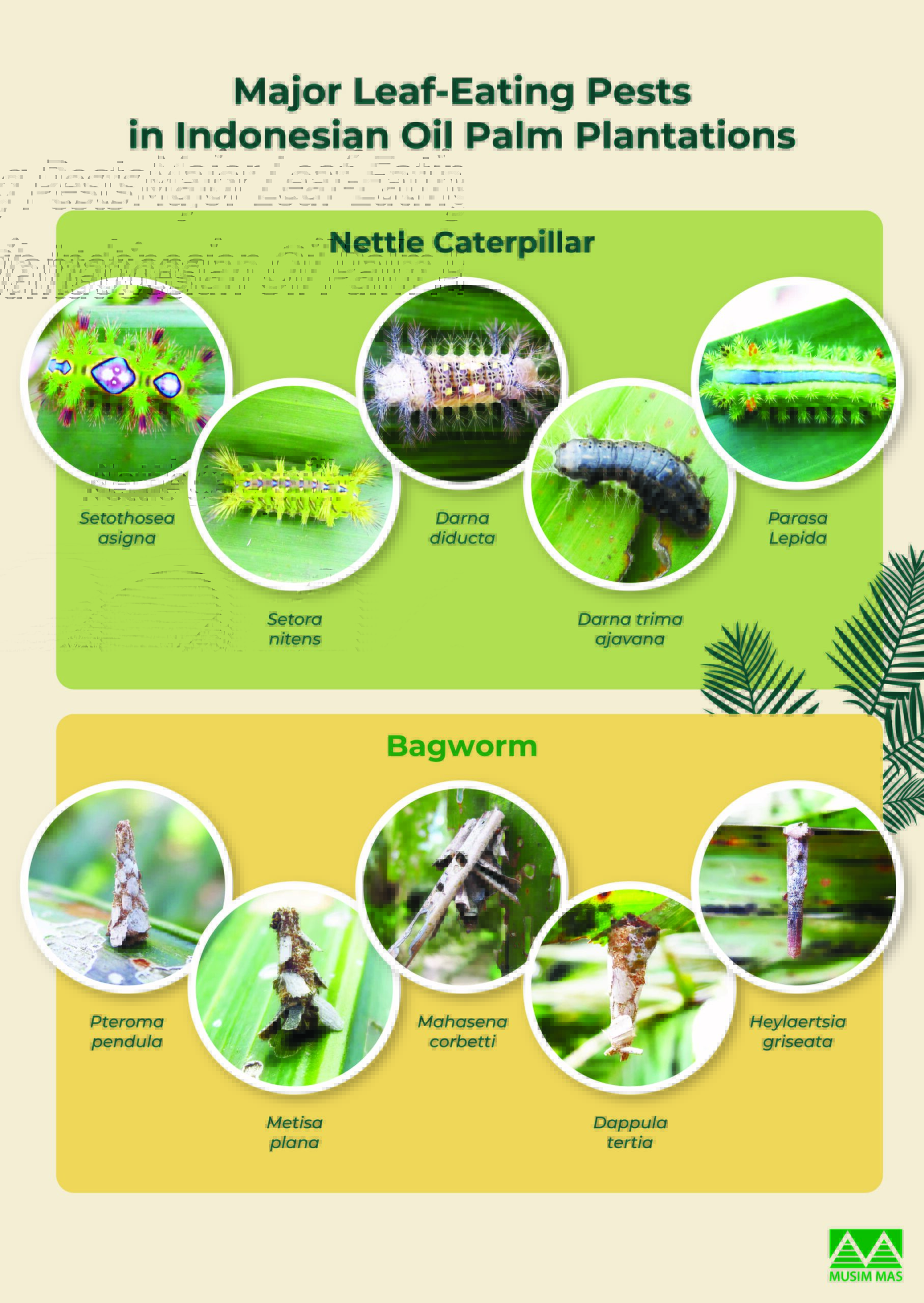 Leaf-eating caterpillars like nettle caterpillars and bagworms are typically found in small numbers in palm plantations.