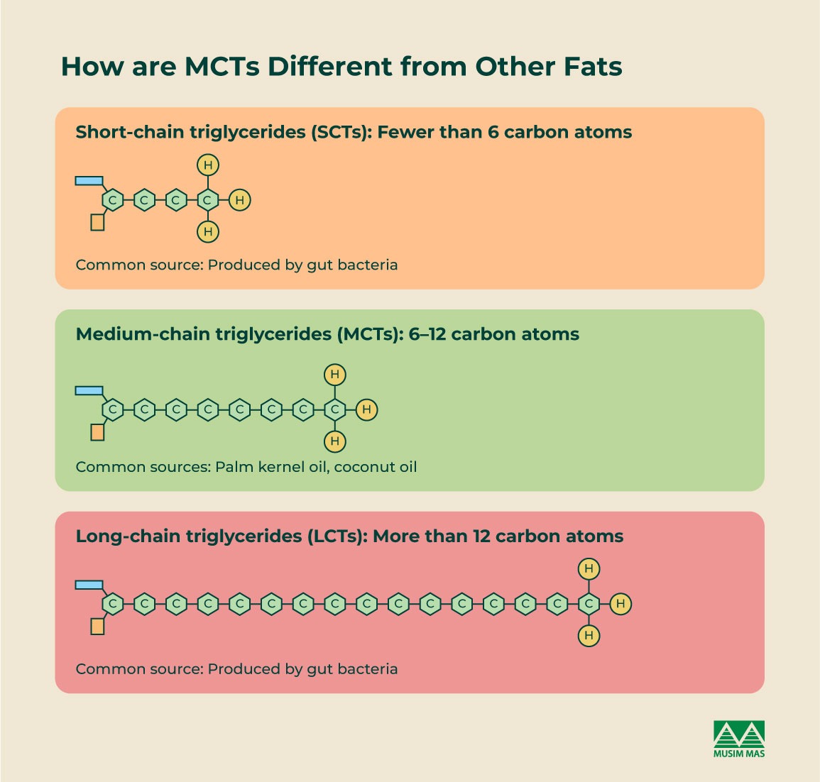 - Medium-chain triglycerides (MCTs): 6–12 carbon atoms