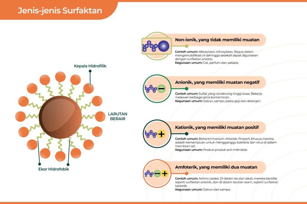 Terdapat empat jenis surfaktan umum yang berbeda berdasarkan muatan listrik dari bagian suka air.