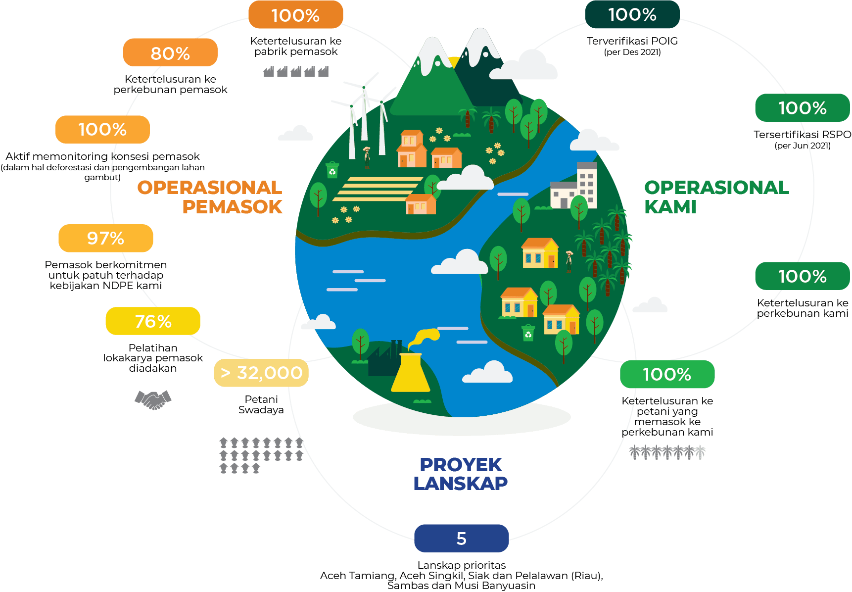 Pihak ketiga memasok sekitar 90% minyak kelapa sawit yang kami perdagangkan dan proses. Kami menginvestasikan sumber daya yang signifikan untuk melacak sumber minyak kami dan untuk mendukung pemasok kami dalam mematuhi Kebijakan Keberlanjutan kami. Kami fokus pada keterlibatan positif dengan memberikan solusi yang disesuaikan dan bantuan teknis untuk membangun kapasitas pemasok kami dan meningkatkan kinerja NDPE mereka.
