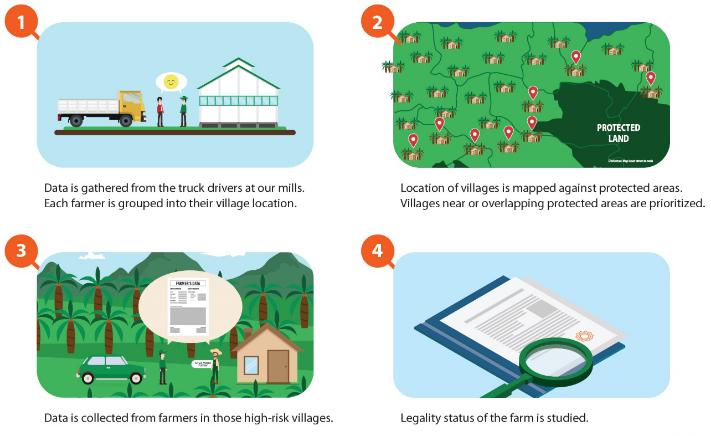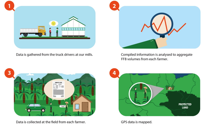 In the ideal approach, the source of FFBs is traced back to the plantation/farm area owned by the respective smallholders.
